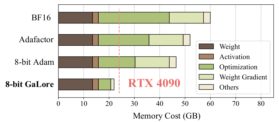 GaLore offers a compelling and accurate alternative to LoRA for memory efficient LLM pre-training and fine-tuning, with the main advantage of being an off-the-shelf pure optimizer algorithm. As mentioned by the authors, an interesting extension of this work would be to investigate how to integrate quantization, in the vein of QLoRA, to push further model size on customer hardware.