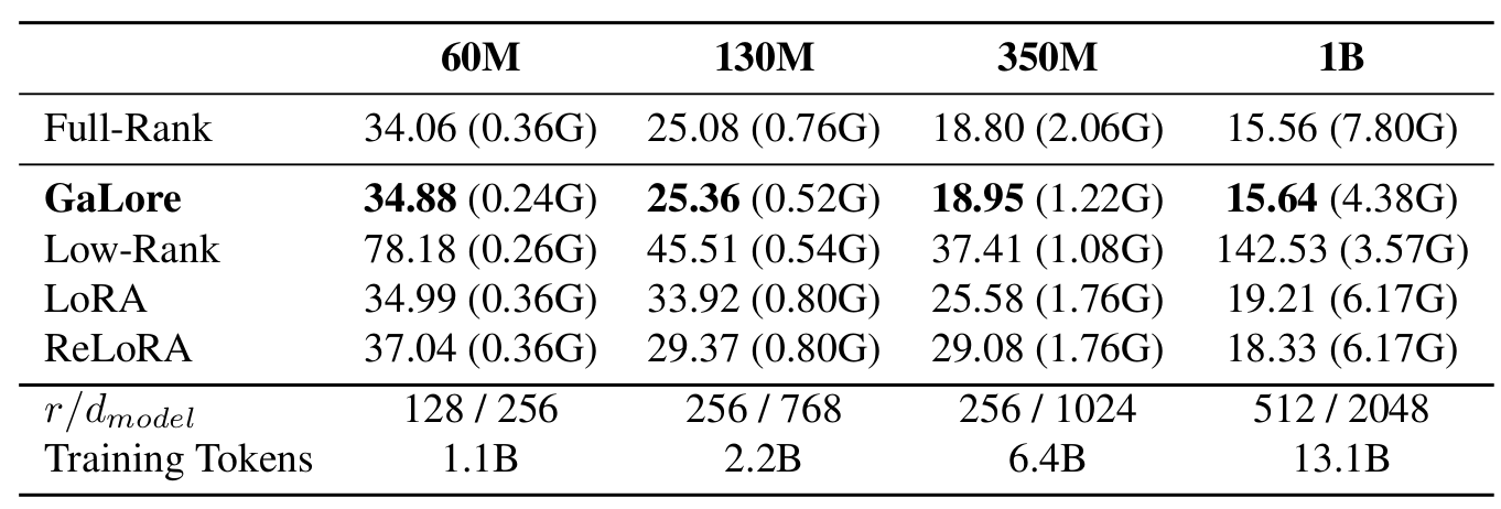 Additionally, GaLore shows much better performance on LLaMA pretraining compared to LoRA and ReLoRA, while using significantly less memory. Interestingly, for pre-training, the subspace rank \(r\) can be seen as an hyperparameter trading-off memory and compute budgets (i.e. a smaller rank requires more iterations to achieve similar accuracy).
