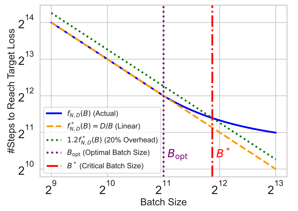 The only thing really lacking is a good intuition for why longer training runs should have a larger CBS. One possibility here is that later in training larger batch sizes are more helpful, as the model improves and more data is required to derive an effective update (i.e. the loss landscape is harder to descend). This opens up the question of whether the CBS increases during training (which may well explain their finding), and if so how might one set a batch size schedule. We look forward to seeing future papers investigate this question!