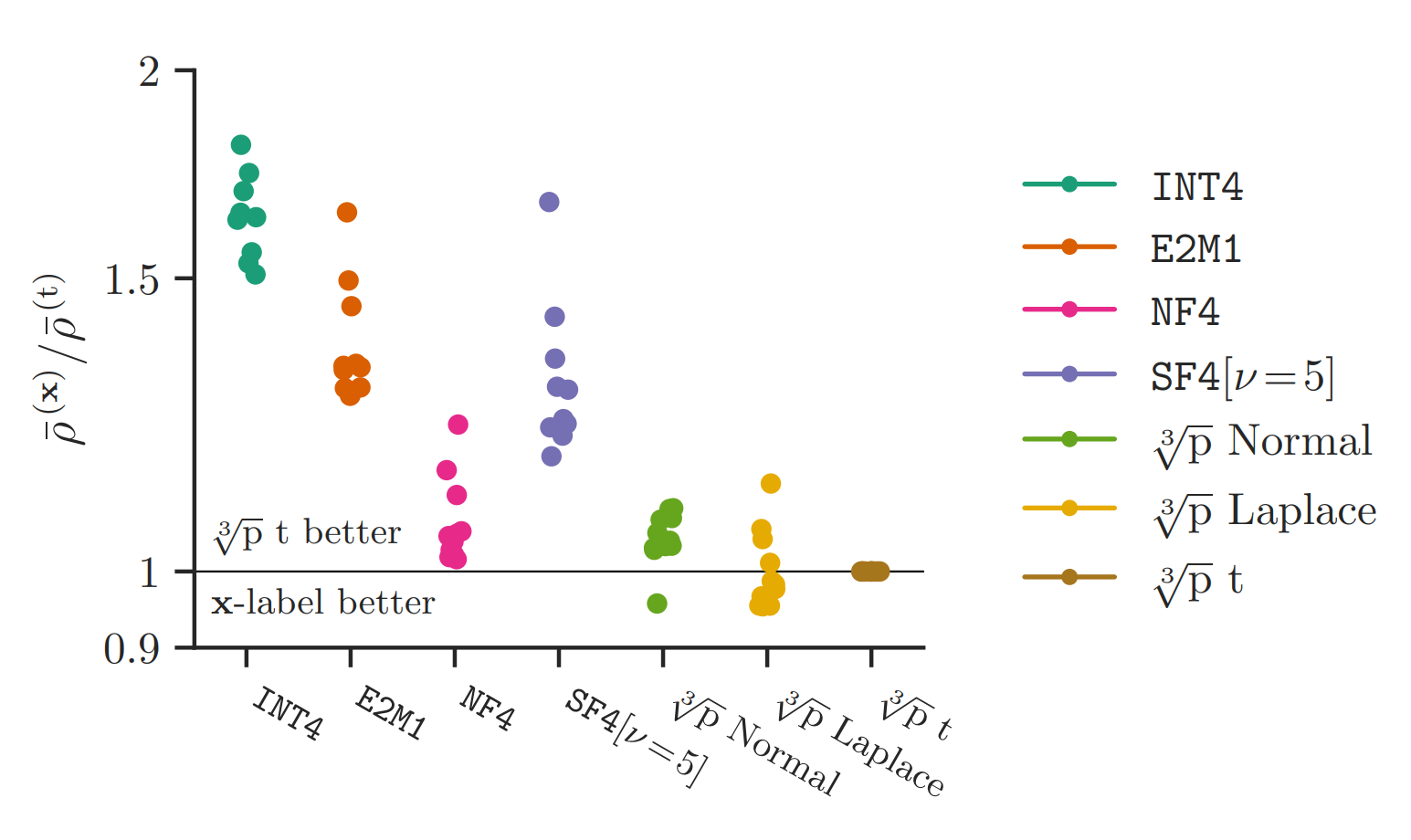 Note that E2M1 is FP4 (4-bit floating point). Each dot corresponds to a different model; lower (scaled KL divergence of model outputs) is better; performance is normalised against the performance of that model under the cube root density block absmax quantiser for the Student's t distribution and averaged over bit widths from 3-5 bits. We see that our normal format is on par with NF4, while the Student's t format consistently outperforms it (note that the Student's t format chooses a df parameter for each tensor separately, to minimise MSE.)